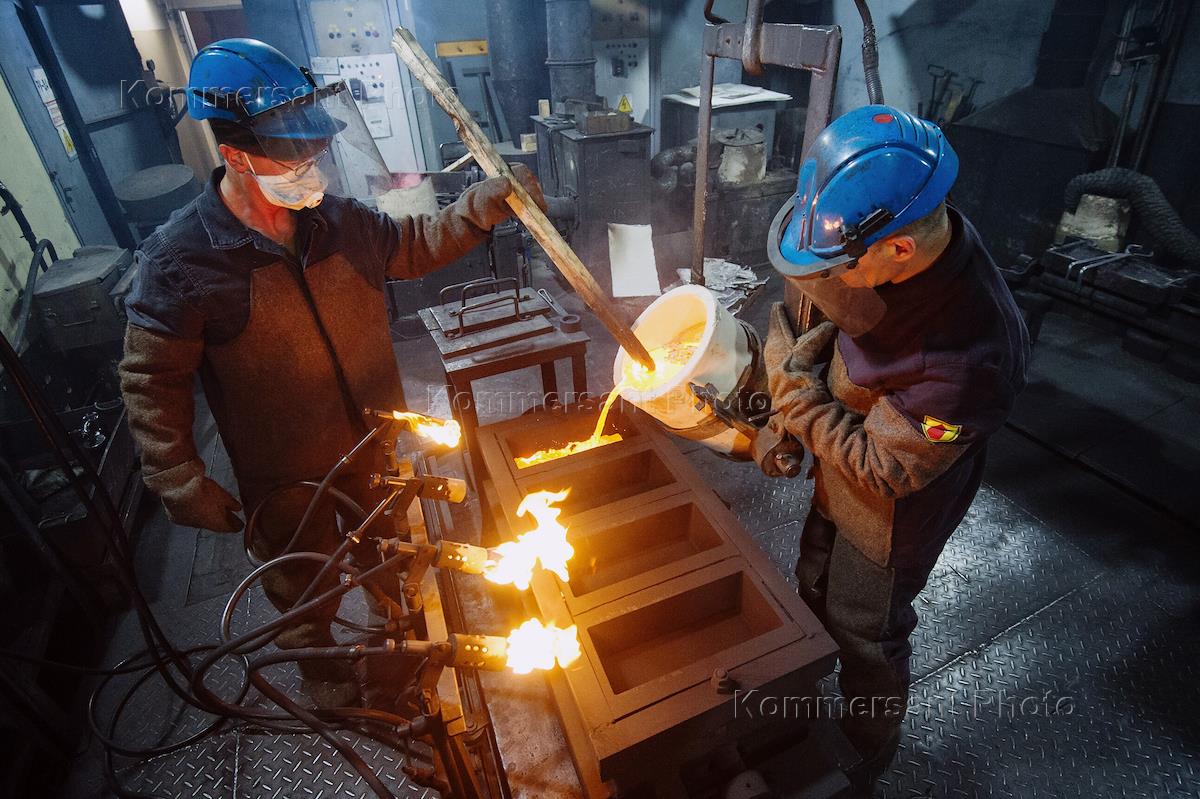 Плавка слитков серебра в литейном цехе Новосибирского аффинажного завода.