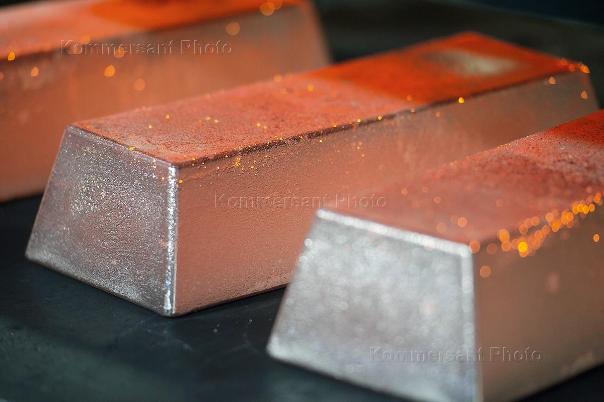 Standard bars of 999.9 fine gold cooling after smelting in the casting shop of the Novosibirsk Refinery Plant.