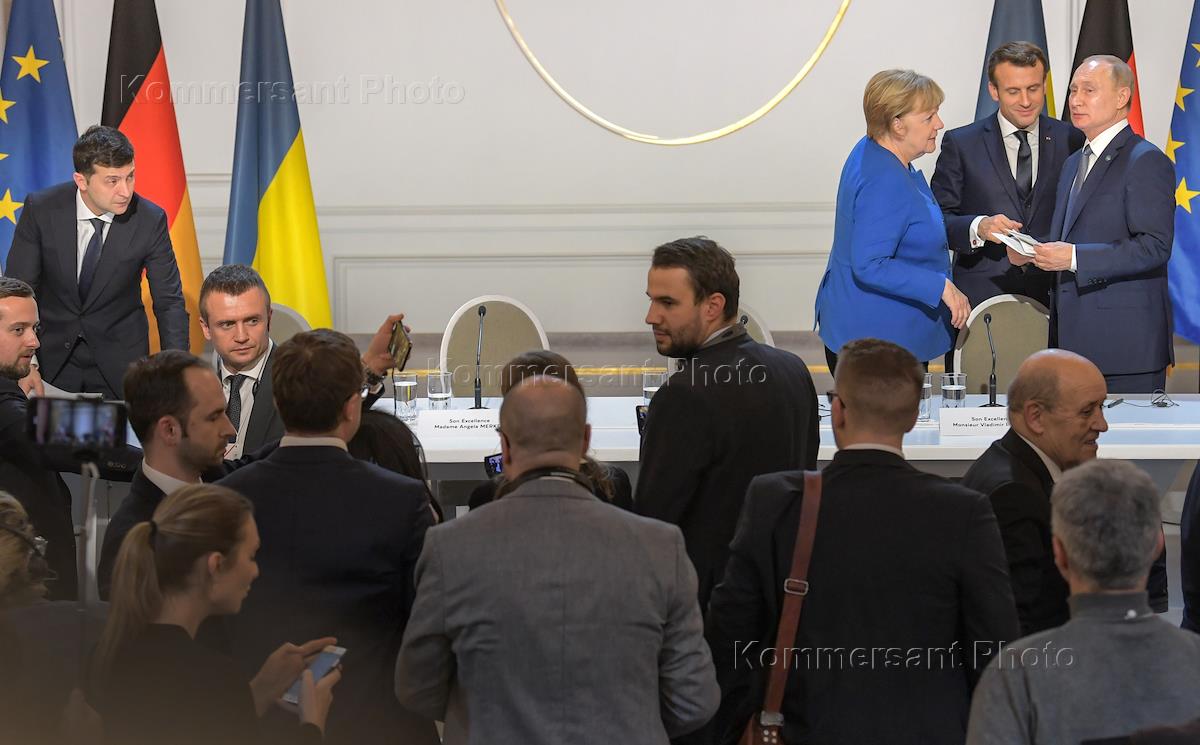 Рабочая поездка президента России Владимира Путина в Париж. Саммит в "нормандском формате" в Елисейском дворце. Справа налево: президент России Владимир Путин, президент Франции Эмманюэль Макрон, канцлер Германии Ангела Меркель и президент Украины Владимир Зеленский (слева) после окончания пресс-конференции по итогам саммита.