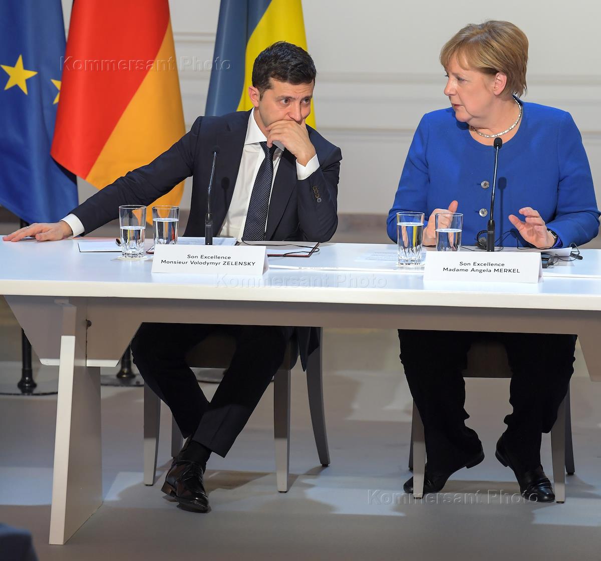 Russian President Vladimir Putin's working visit to Paris. Normandy format summit at the Elysee Palace. Chancellor of Germany Angela Merkel and President of Ukraine Volodymyr Zelensky at the press conference following the summit.