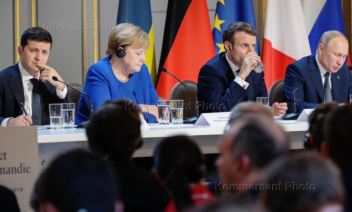 Working trip of Russian President Vladimir Putin to Paris. Normandy format summit at the Elysee Palace. From right to left: Russian President Vladimir Putin, French President Emmanuel Macron, German Chancellor Angela Merkel and Ukrainian President Vladimir Zelensky during a press conference following the summit.