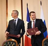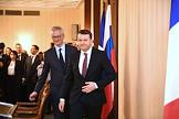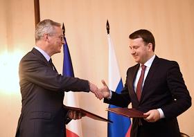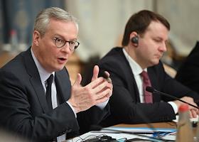 Пленарное заседание XXV сессии Российско-французского совета по экономическим, финансовым, промышленным и торговым вопросам в "Президент-Отеле". Министр экономики и финансов Франции Брюно Ле Мэр (второй справа) и министр экономического развития России Максим Орешкин (справа) во время заседания.