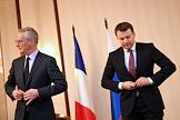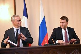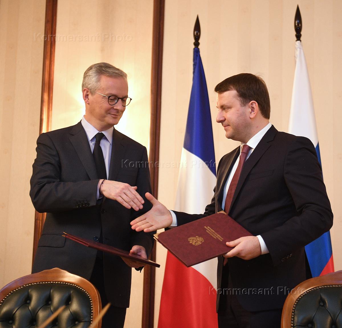 Пленарное заседание XXV сессии Российско-французского совета по экономическим, финансовым, промышленным и торговым вопросам в "Президент-Отеле". Министр экономики и финансов Франции Брюно Ле Мэр (слева) и министр экономического развития России Максим Орешкин (справа) во время заседания.
