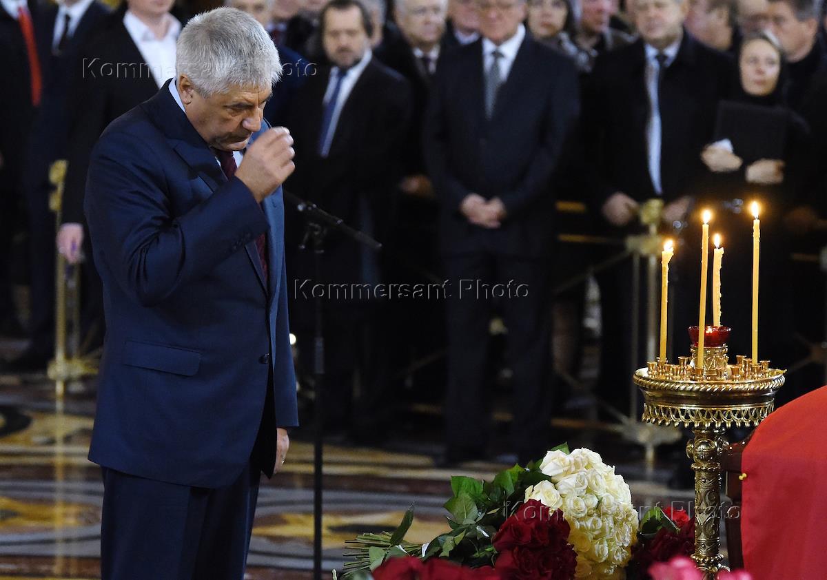 Final farewell to Ex-Mayor of Moscow Yury Luzhkov in the Cathedral of Christ the Savior. Russian Minister of the Interior Vladimir Kolokoltsev at the ceremony.