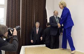 XXI cъезд партии "Яблоко" в зале Научно-методического центра профсоюзов работников агропромышленного комплекса (АПК) России в городе Московский в Новой Москве. Справа налево: председатель Псковского регионального отделения партии "Яблоко", кандидат на должность председателя партии Лев Шлосберг, члены политического комитета партии "Яблоко" Виктор Шейнис и cопредседатель Московской Хельсинской группы, cопредседатель правозащитной фракции партии "Яблоко" Валерий Борщев во время съезда.