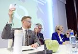 XXI cъезд партии "Яблоко" в зале Научно-методического центра профсоюзов работников агропромышленного комплекса (АПК) России в городе Московский в Новой Москве. Слева направо: заместитель председателя партии "Яблоко", кандидат на должность председателя партии Николай Рыбаков, заместитель председателя партии "Яблоко" Сергей Иваненко и председатель партии "Яблоко" Эмилия Слабунова во время съезда.