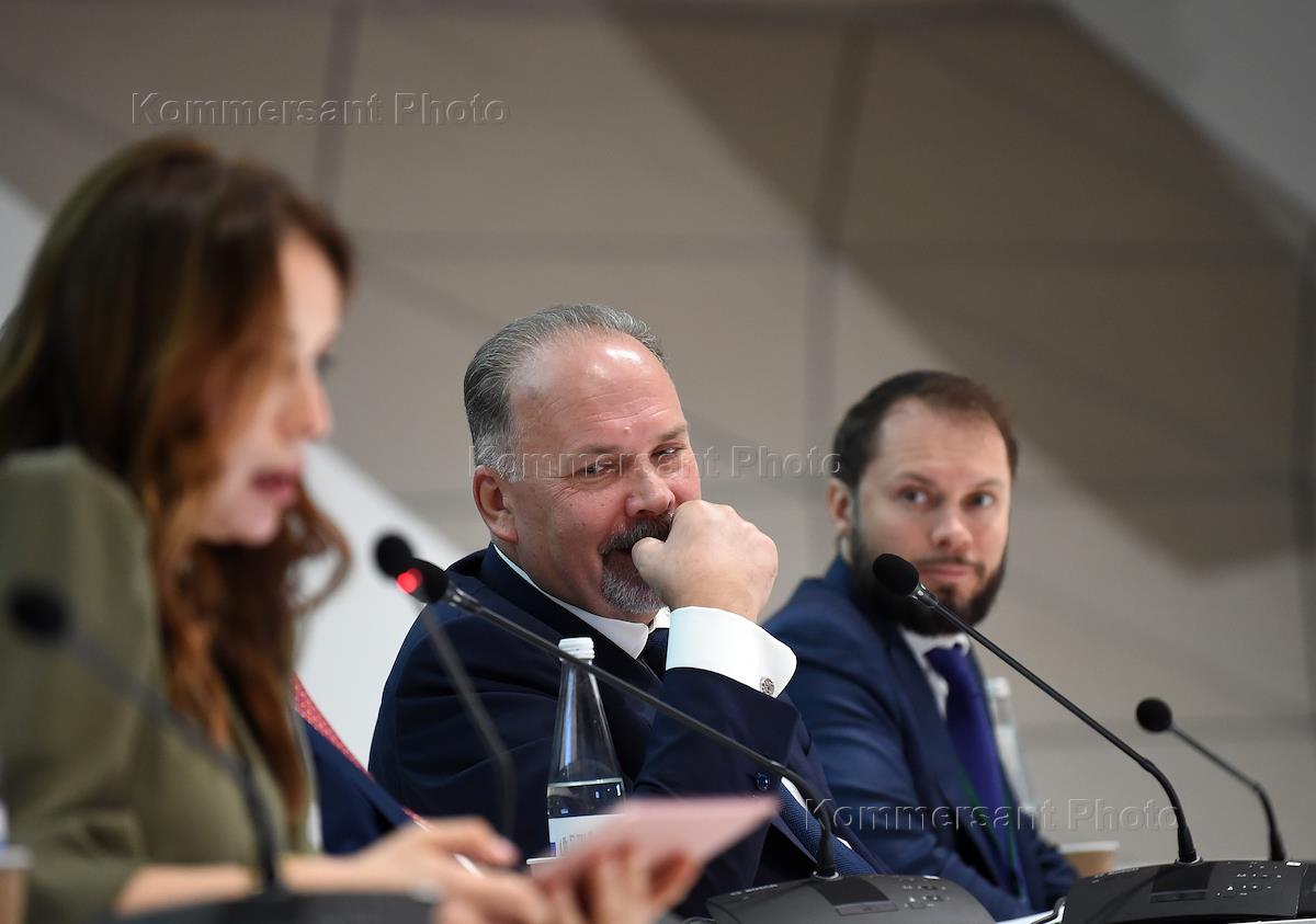 Международный форум-выставка "Чистая страна" в Технопарке "Сколково". Слева направо: телеведущая, главный редактор телеканала "Живая планета" Мария Моргун, аудитор Счетной палаты России Михаил Мень и заместитель руководителя Федеральной антимонопольной службы (ФАС) России Виталий Королев на пленарной сессии "Сохраняя будущее: первые итоги реализации нацпроекта "Экология".