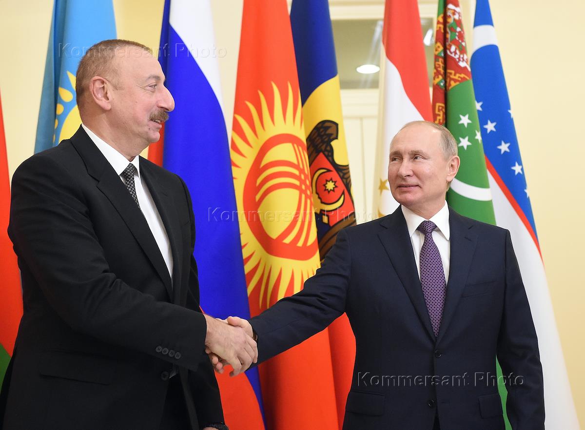 Russian President Vladimir Putin's working visit to Saint Petersburg. President of Azerbaijan Ilham Aliyev (left) and Russian President Vladimir Putin (right) during the meeting of Heads of State and Government of member states of the Supreme Eurasian Economic Council. The meeting was held in Boris Yeltsin Presidential Library.