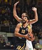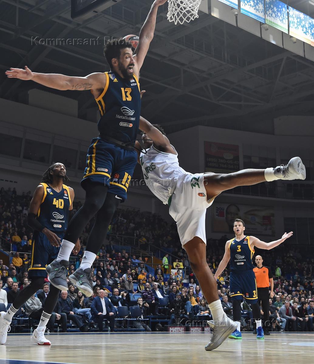 Euroleague Basketball. Match between Khimki (Khimki, Russia) and Zalgiris (Kaunas, Lithuania) at the Mytishchi Arena sports complex. Khimki's Devin Booker (center) and Zalgiris' Martinas Geben (right) during the match.