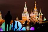 Виды Москвы. Новогодняя иллюминация в ландшафтном парке "Зарядье". Собор Василия Блаженного (Покровский собор) и Спасская башня Кремля.