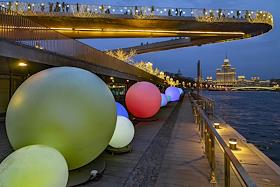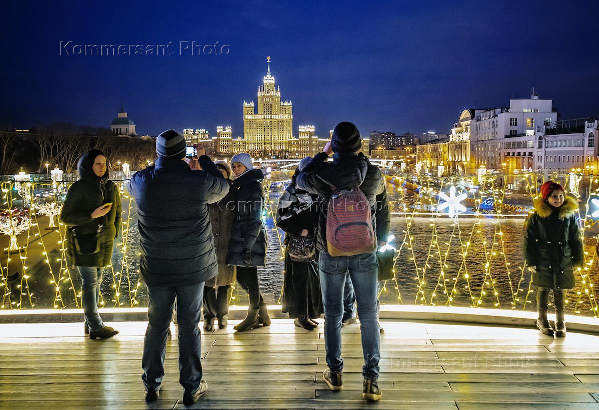Виды Москвы. Новогодняя иллюминация в ландшафтном парке "Зарядье". Посетители парка на стеклянном (парящем) мосту.