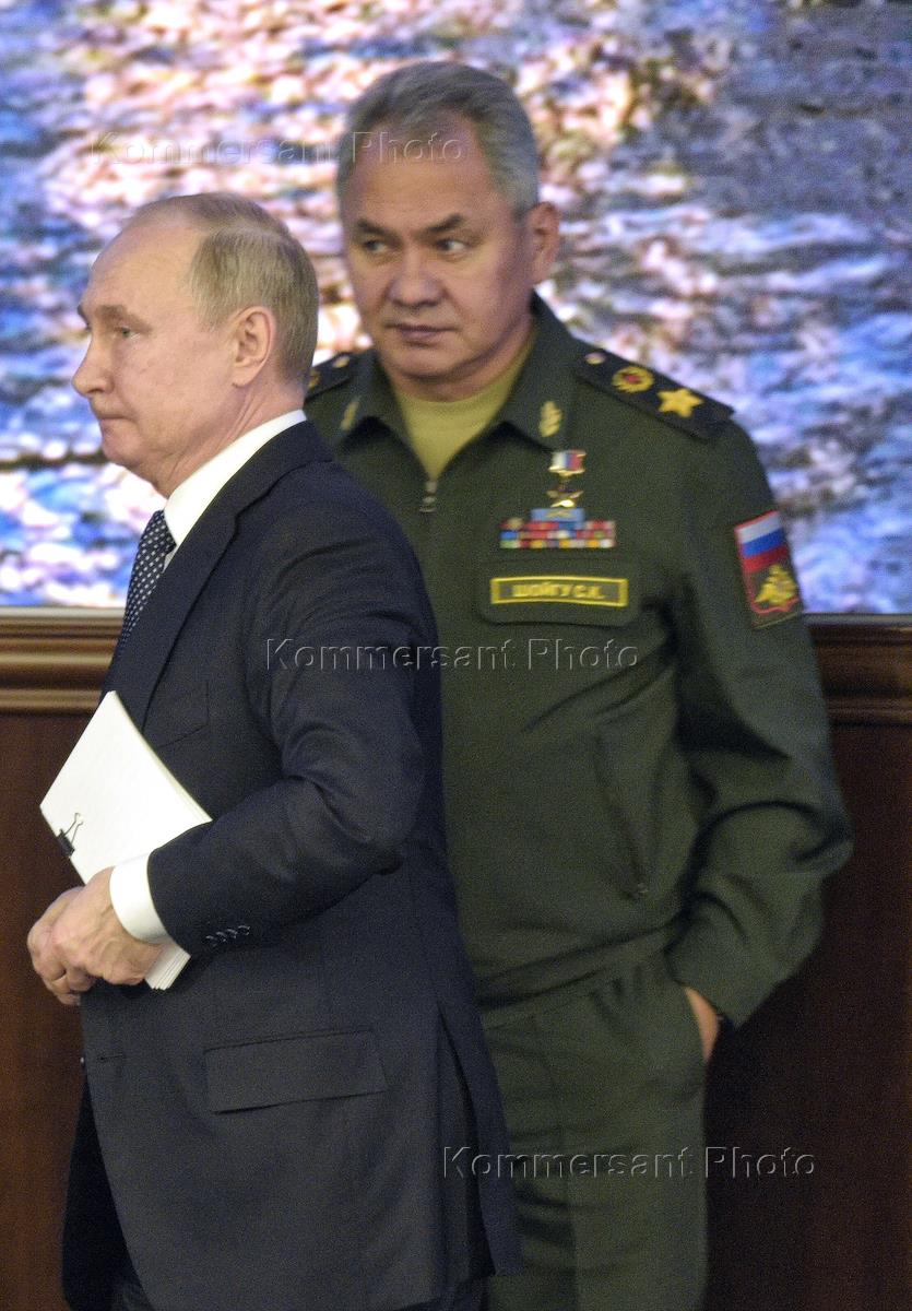 Расширенное заседание коллегии министерства обороны России. Министр обороны России Сергей Шойгу (слева) и президент России Владимир Путин (справа) на заседании.
