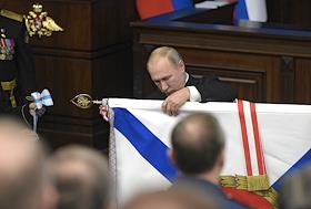 Ежегодная расширенная коллегия министерства обороны России. Президент России Владимир Путин во время церемонии награждения воинских и флотских частей на заседании в Национальном центре управления обороной.
