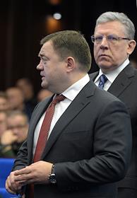 Ежегодная расширенная коллегия министерства обороны России. Председатель ПАО "Промсвязьбанк" Петр Фрадков (слева) и председатель Счетной палаты России Алексей Кудрин (справа) перед началом заседания в Национальном центре управления обороной.