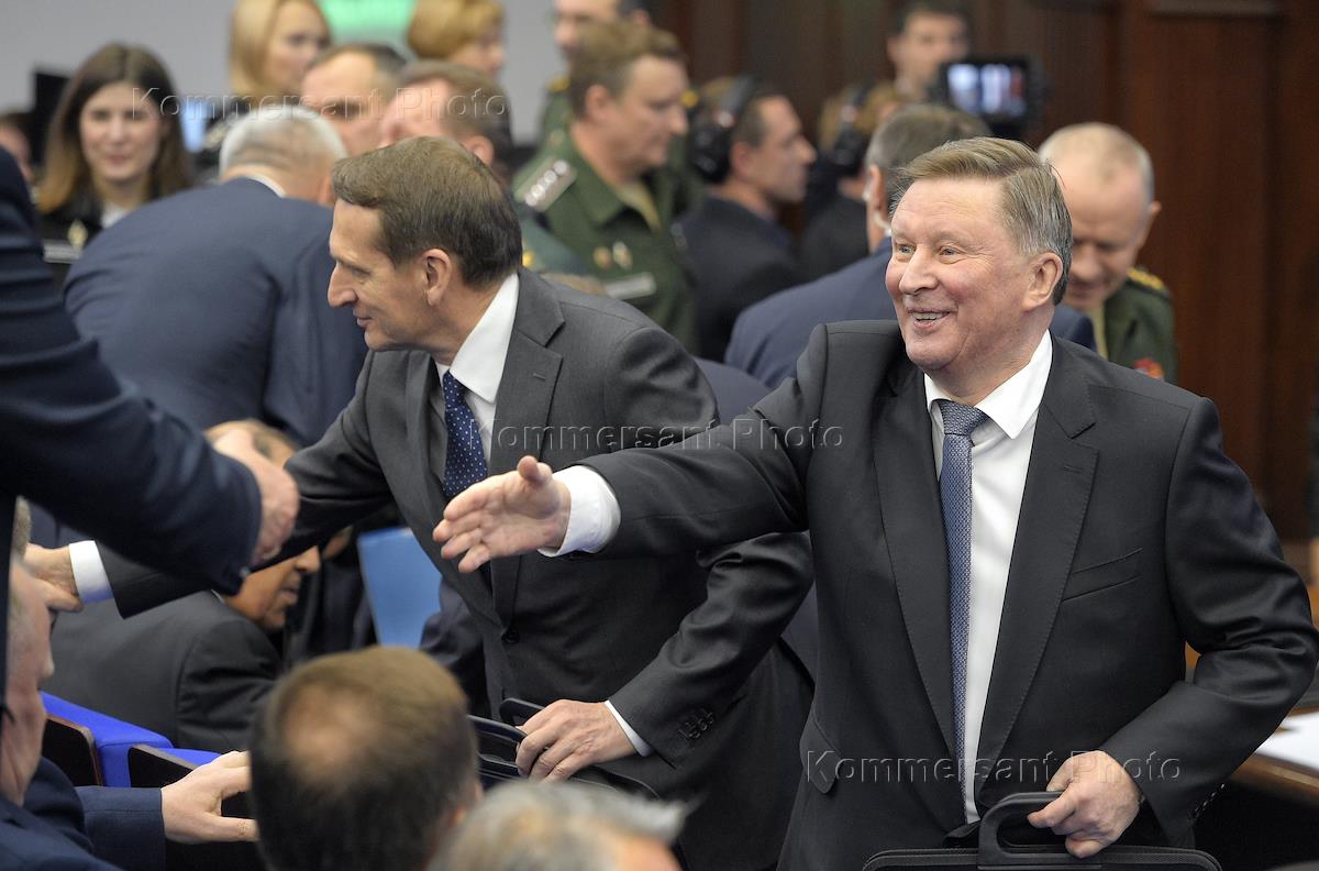 Ежегодная расширенная коллегия министерства обороны России. Директор Службы внешней разведки Сергей Нарышкин (в центре) и специальный представитель президента России по вопросам природоохранной деятельности, экологии и транспорта Сергей Иванов (справа) перед началом заседания в Национальном центре управления обороной.