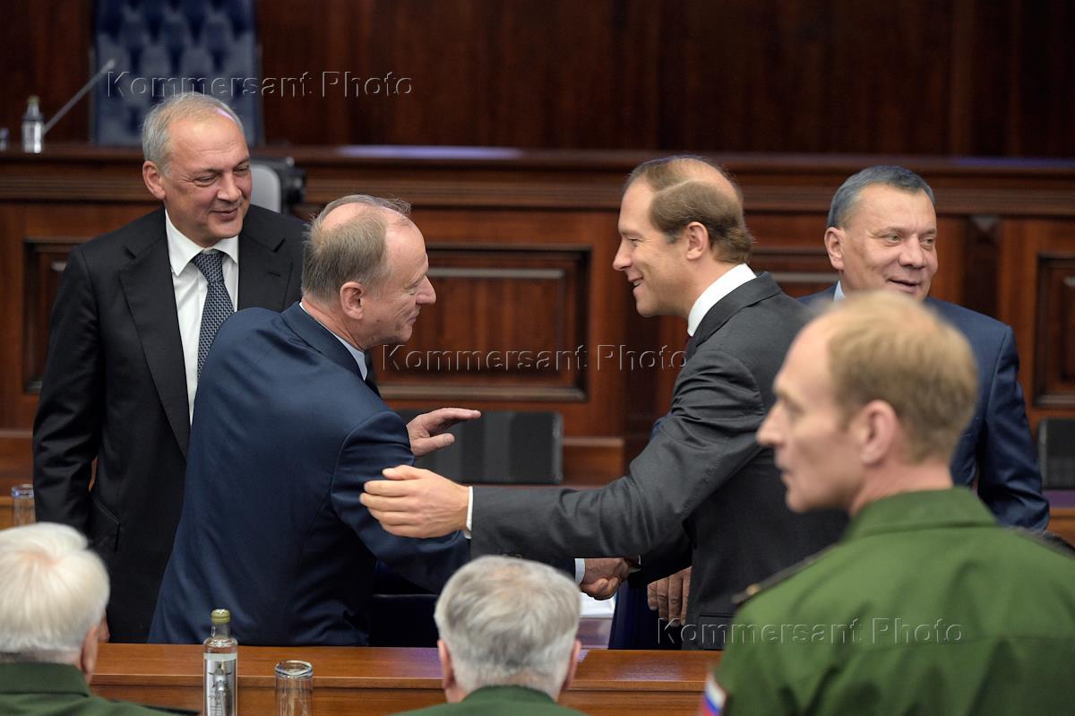 Annual expanded meeting of the Ministry of Defense of Russia. From left: Deputy Chief of Staff of the Presidential Executive Office Magomedsalam Magomedov, Secretary of the Security Council of Russia Nikolai Patrushev, Minister of Industry and Trade of Russia Denis Manturov and Deputy Prime Minister of Russia Yury Borisov before the meeting in the National Defense Management Center.