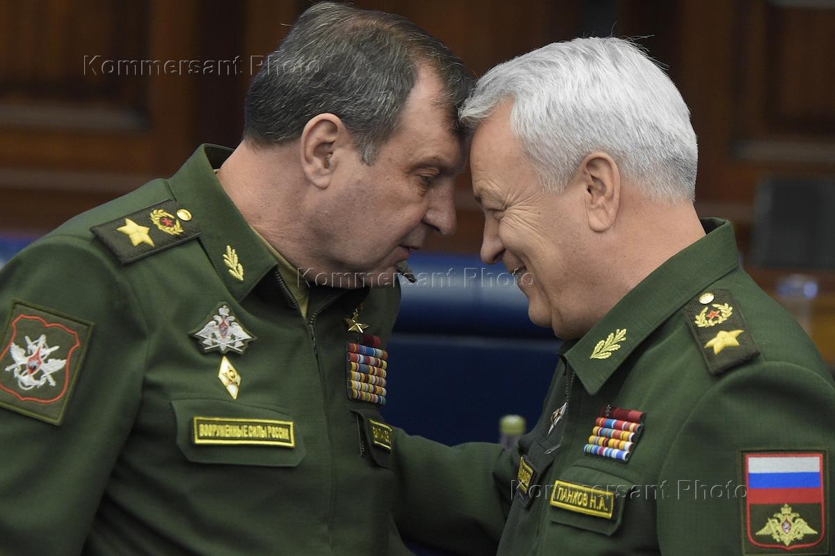 Ежегодное расширенное заседание коллегии министерства обороны России в Национальном центре управления обороной. директор Федеральной службы войск национальной гвардии России - главнокомандующий войсками национальной гвардии России Виктор Золотов (второй справа) и статс-секретарь - заместитель министра обороны России Николай Панков (справа) перед началом заседания.