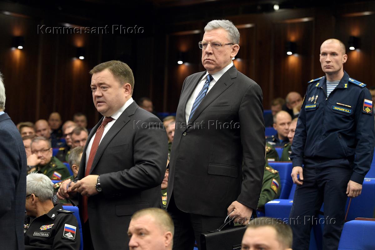 Annual expanded meeting of the Ministry of Defense of Russia. Promsvyazbank CEO Pyotr Fradkov (left) and Chairman of the Accounts Chamber of Russia Alexei Kudrin (right) before the meeting in the National Defense Management Center.