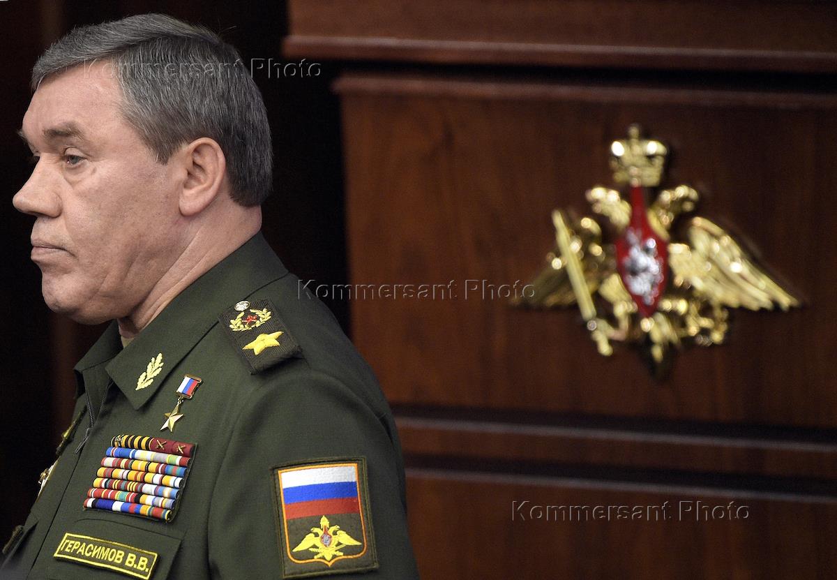 Ежегодное расширенное заседание коллегии министерства обороны России в Национальном центре управления обороной. Начальник Генерального штаба Вооруженных сил России — первый заместитель министра обороны России Валерий Герасимов, на заседании.
