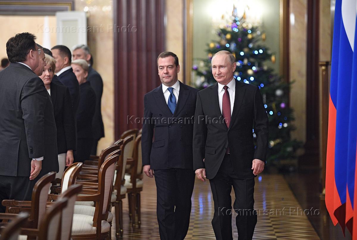 Заседание правительства России. Председатель правительства России Дмитрий Медведев (слева) и президент России Владимир Путин (справа) во время заседания.