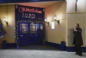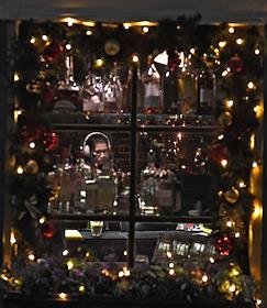 Виды вечерней Москвы. Новогоднее убранство города. Празднично оформление витрины ресторана.