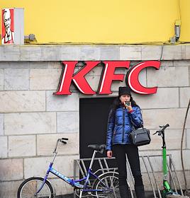 Жанровая фотография. Девушка с мобильным телефоном возле парковки велосипедов и самокатов рядом с рестораном быстрого питания сети KFC.