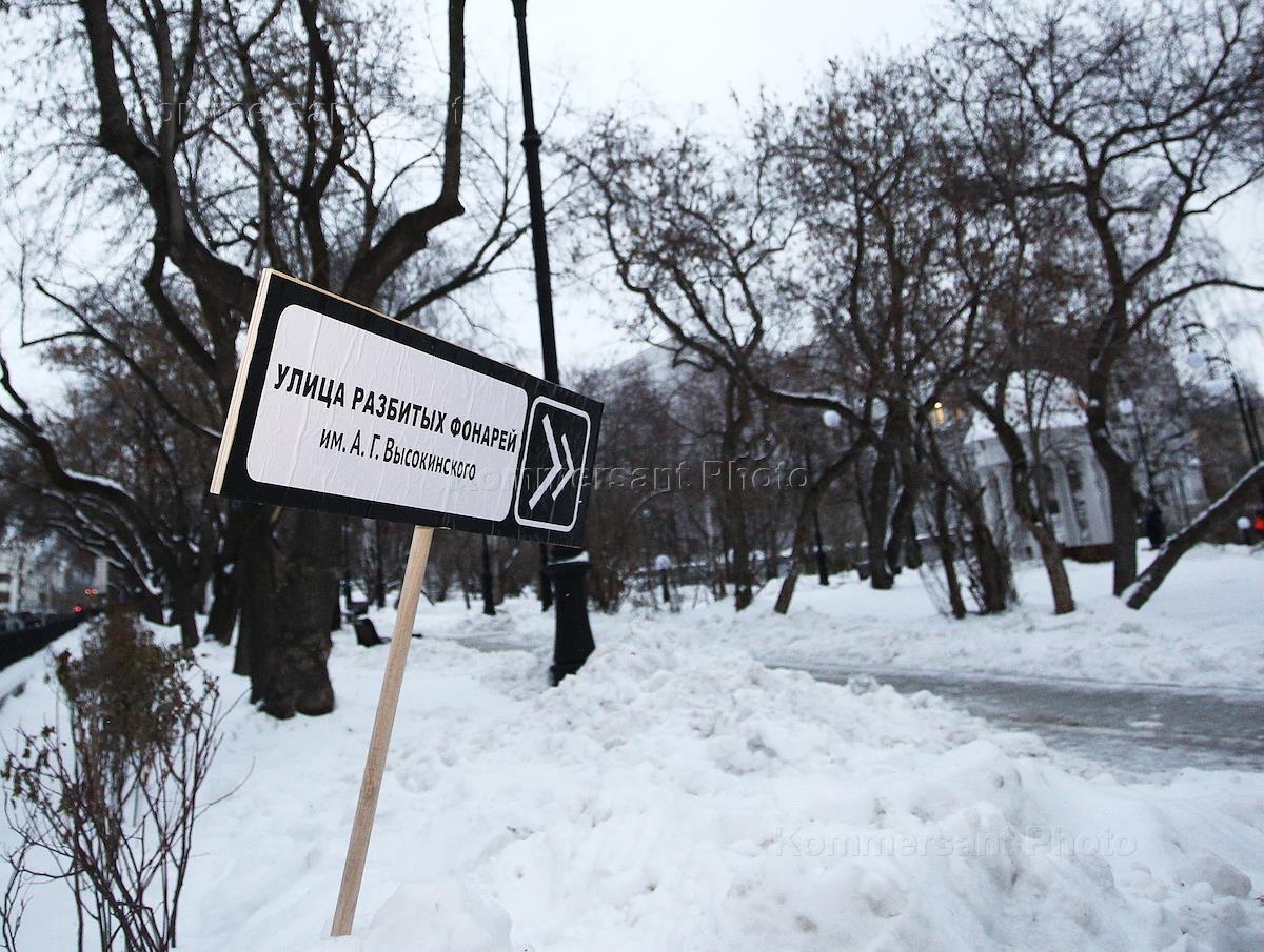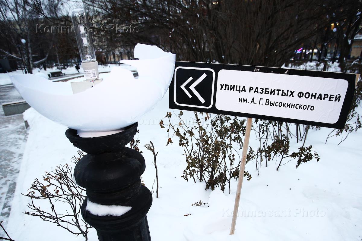 Таблички указатель "Улица разбитых фонарей имени Высокинского" в сквере за Театром оперы и балета.