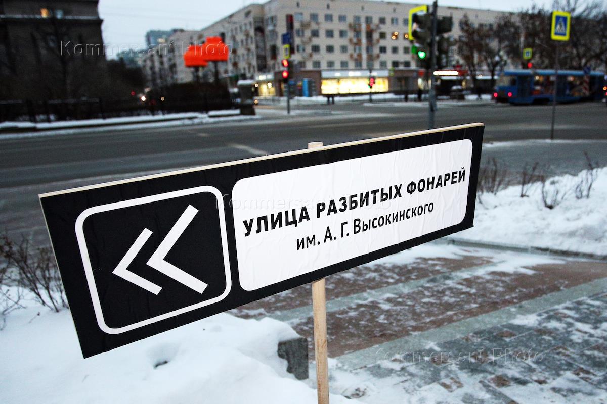 Виды Екатеринбурга. Таблички "Улица разбитых фонарей имени А.Г.Высокинского" в сквере за Екатеринбургским театром оперы и балета.