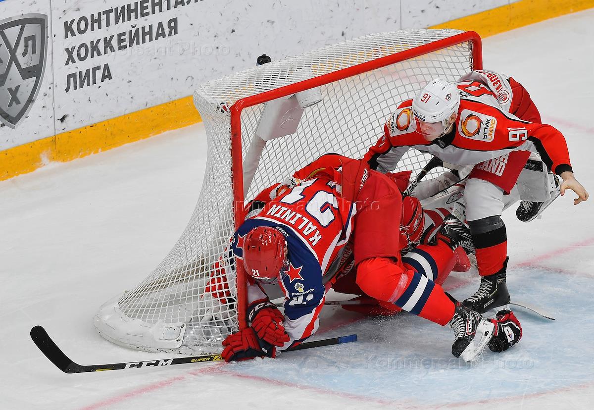 Континентальная хоккейная лига (КХЛ). Чемпионат сезона 2019/20. Матч между командами ЦСКА (Москва) и "Автомобилист" (Екатеринбург) на стадионе "ЦСКА Арена". Слева направо: игроки команды ЦСКА Максим Шалунов, Богдан Киселевич и игрок команды "Автомобилист" Питер Холланд во время матча.