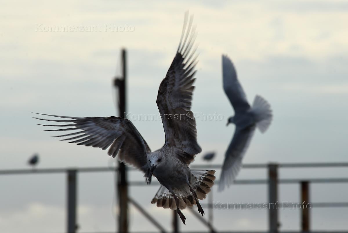 Жанровая фотография. Чайки сидят на столбиках ограждения пирса.