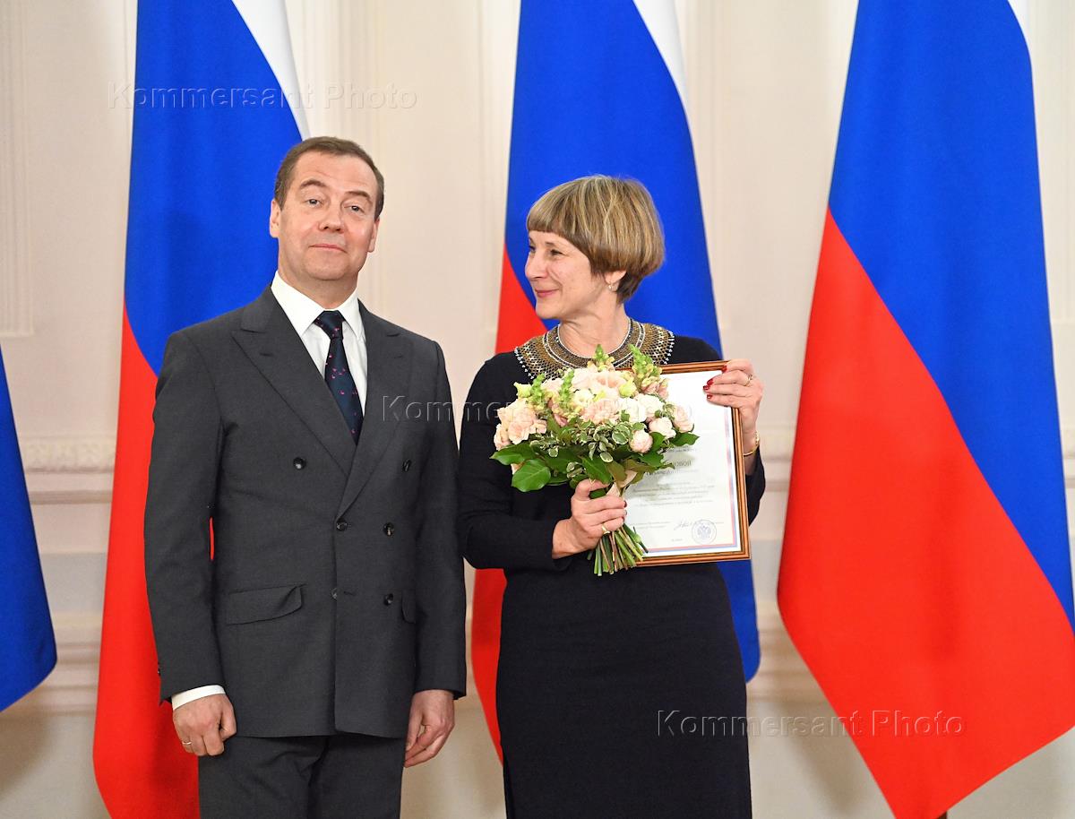 Government Media Prize 2019 awarding ceremony. Russian Prime Minister Dmitry Medvedev (left) and culture reporter of the Kommersant newspaper Tatyana Kuznetsova (right) during the ceremony.