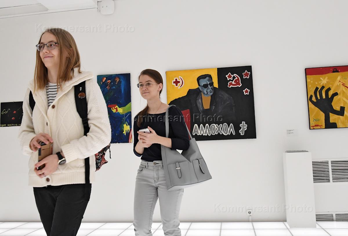 Юбилейная выставка "MMOMA 99/19", приуроченная к ХХ-летию Московского музея современного искусства (ММОМА). Посетители на выставке.