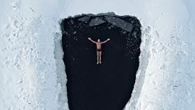 Жанровая фотография. Человек, практикующий экстремальное закаливание в виде купания зимой, - морж - во время заплыва.