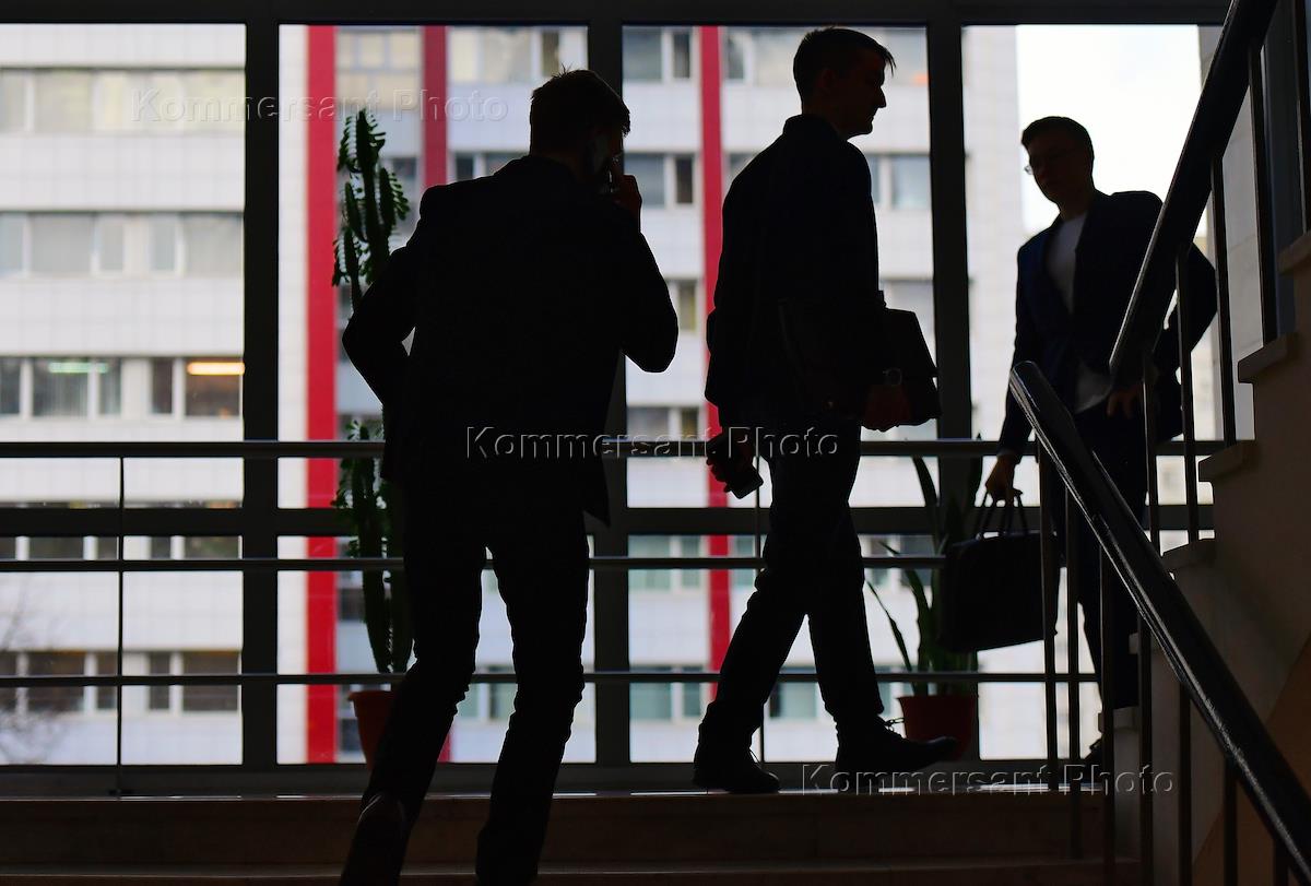 XI Гайдаровский форум "Россия и мир: вызовы нового десятилетия" прошел в Российской академии народного хозяйства и госслужбы (РАНХиГС). День первый. Жанровая фотография. Участники на лестнице перед началом работы форума.