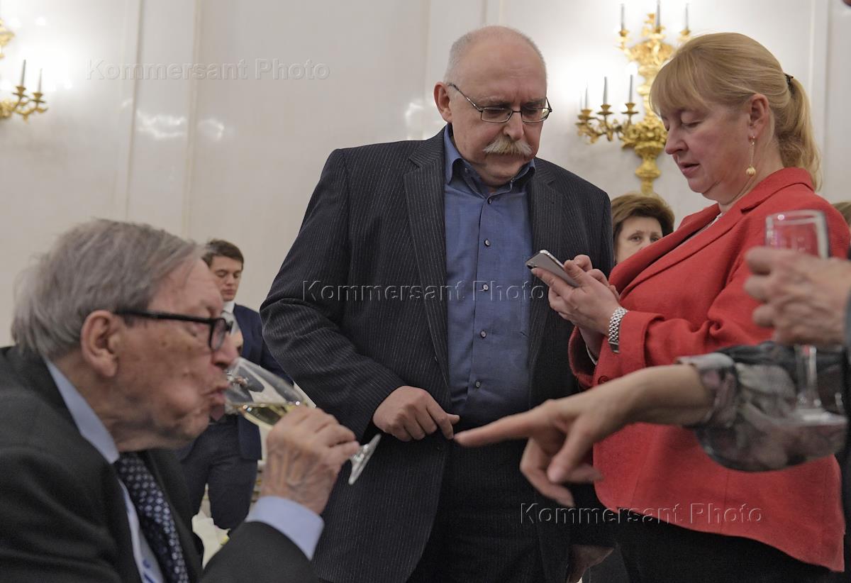 Церемония вручения премии Москвы 2019 года в области журналистики в Белом зале Мэрии. Мэр Москвы Сергей Собянин (справа) и заведующий кафедры зарубежной журналистики и литературы факультета журналистики Московского государственного университета им. М. В. Ломоносова Ясен Засурский (в центре) во время церемонии.