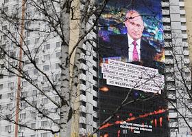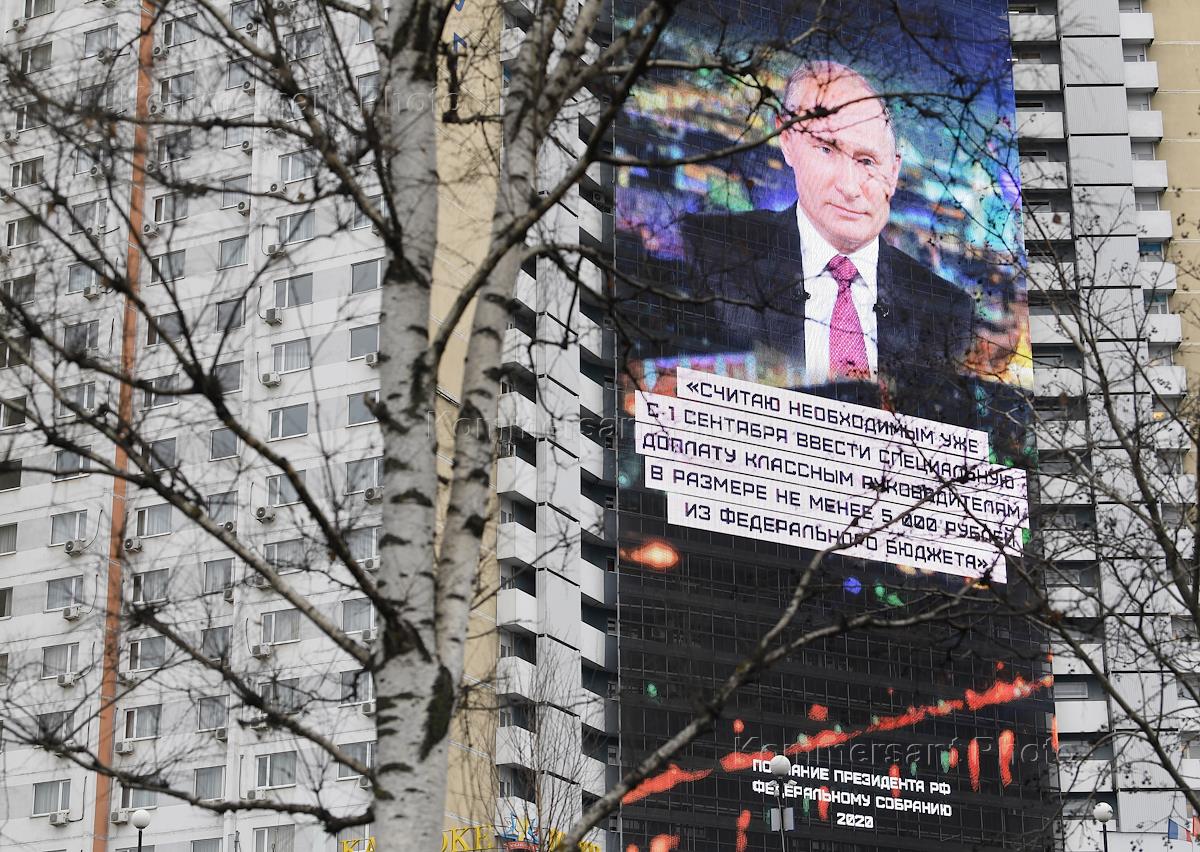 Жанровая фотография. Трансляция ежегодного Послания президента России Владимира Путина Федеральному Собранию на мониторе стены гостиницы "Салют".