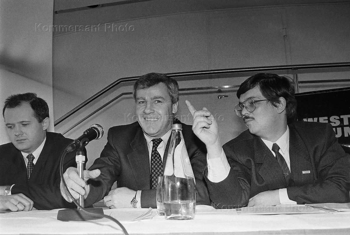 Встреча представителей коммерческих банков. Слева направо: экономист Межэкономсбербанка дмитрий Левин, представитель банка Western Union Джон Скиннер и исполнительный директор компании Western Union в России Сергей Кочергин во время пресс-конференции.