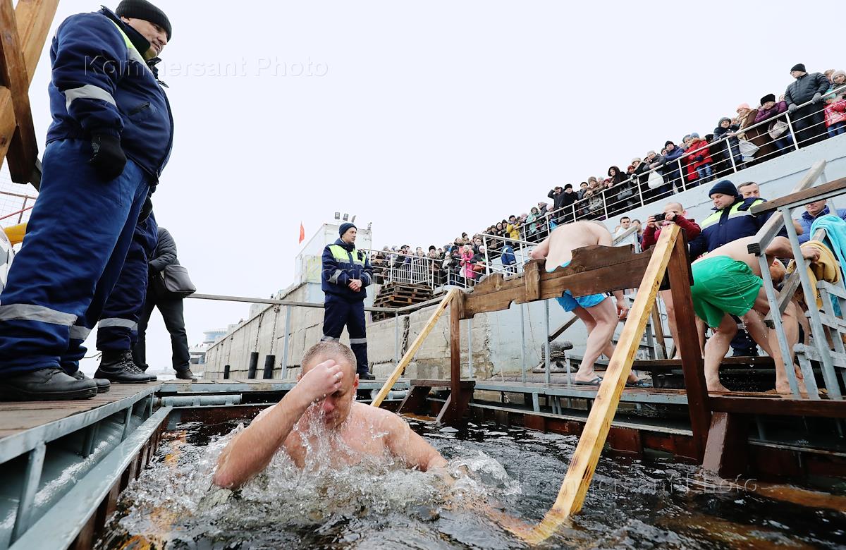 Праздник Крещения Господня. Верующие во время массовых крещенских купаний на Центральной набережной.