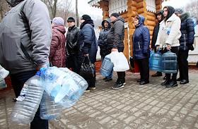 Праздник Крещения Господня. Верующие с бутылями в очереди за крещенской водой из источника.