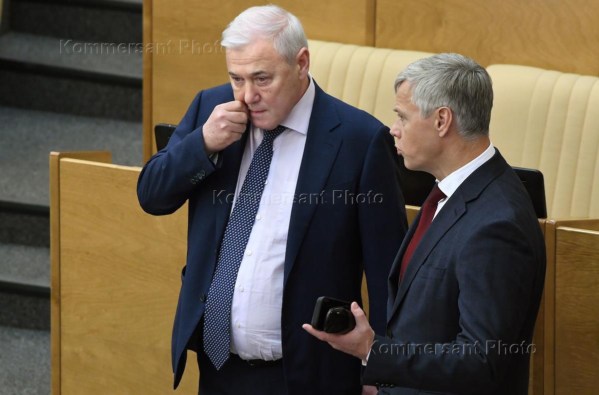 Пленарное заседание Государственной думы (ГД) России. Первый заместитель председателя комитета ГД России по природным ресурсам, собственности и земельным отношениям Василий Власов (слева) и первый заместитель председателя комитета ГД России по охране здоровья Сергей Натаров (справа) перед началом заседания.