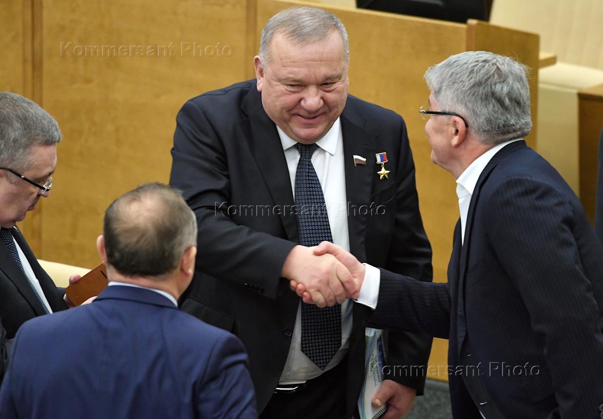Пленарное заседание Государственной думы (ГД) России. Заместитель председателя комитета ГД России по природным ресурсам, собственности и земельным отношениям Николай Будуев (в центре) и заместитель председателя комитета ГД России по контролю и Регламенту Наталья Костенко (справа) перед началом заседания.