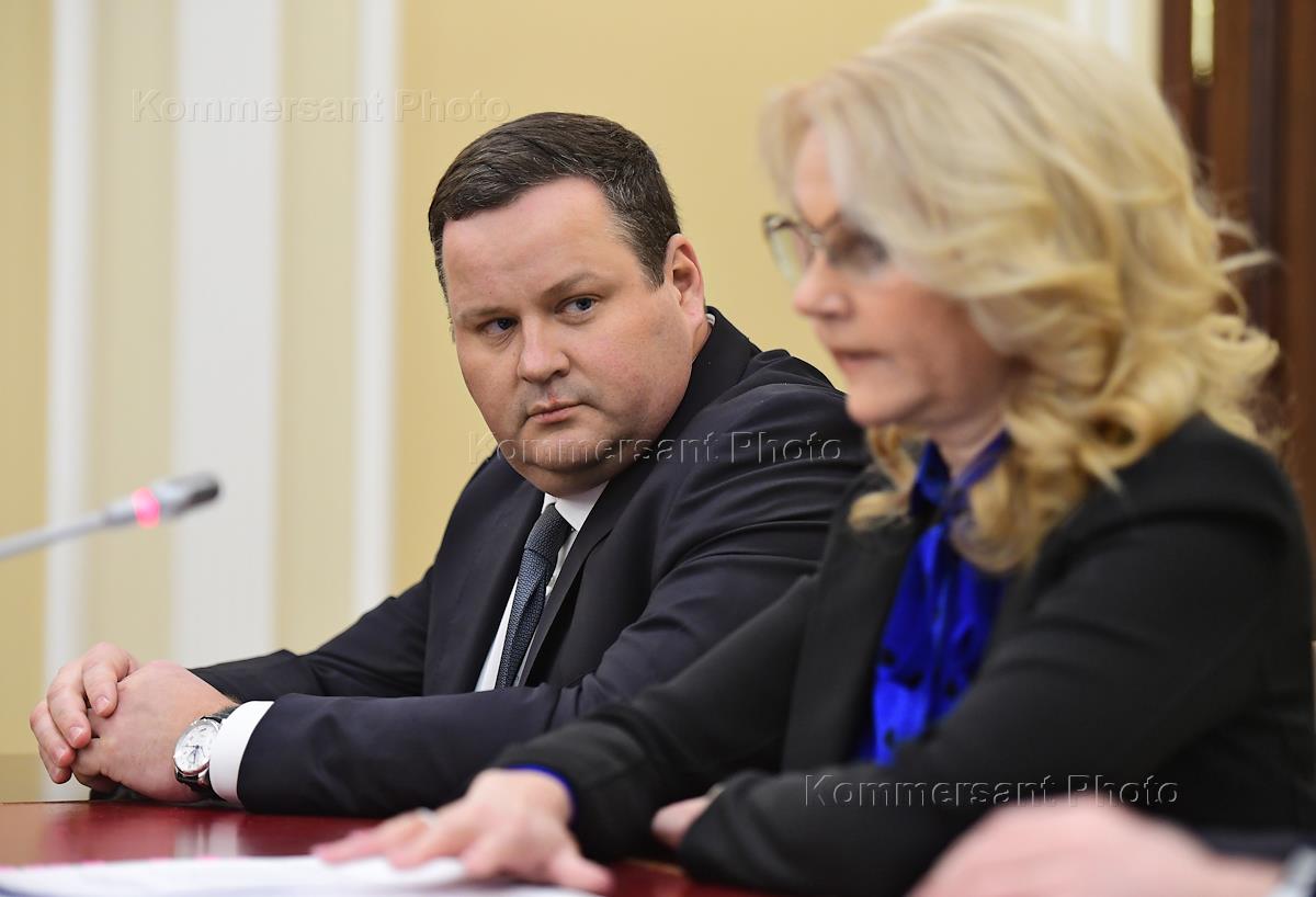 Церемония представление нового министра труда и социальной защиты России коллективу Министерства труда и социальной защиты России. Министр труда и социальной защиты России Антон Котяков (слева) и заместитель председателя правительства России Татьяна Голикова (справа) во время церемонии.