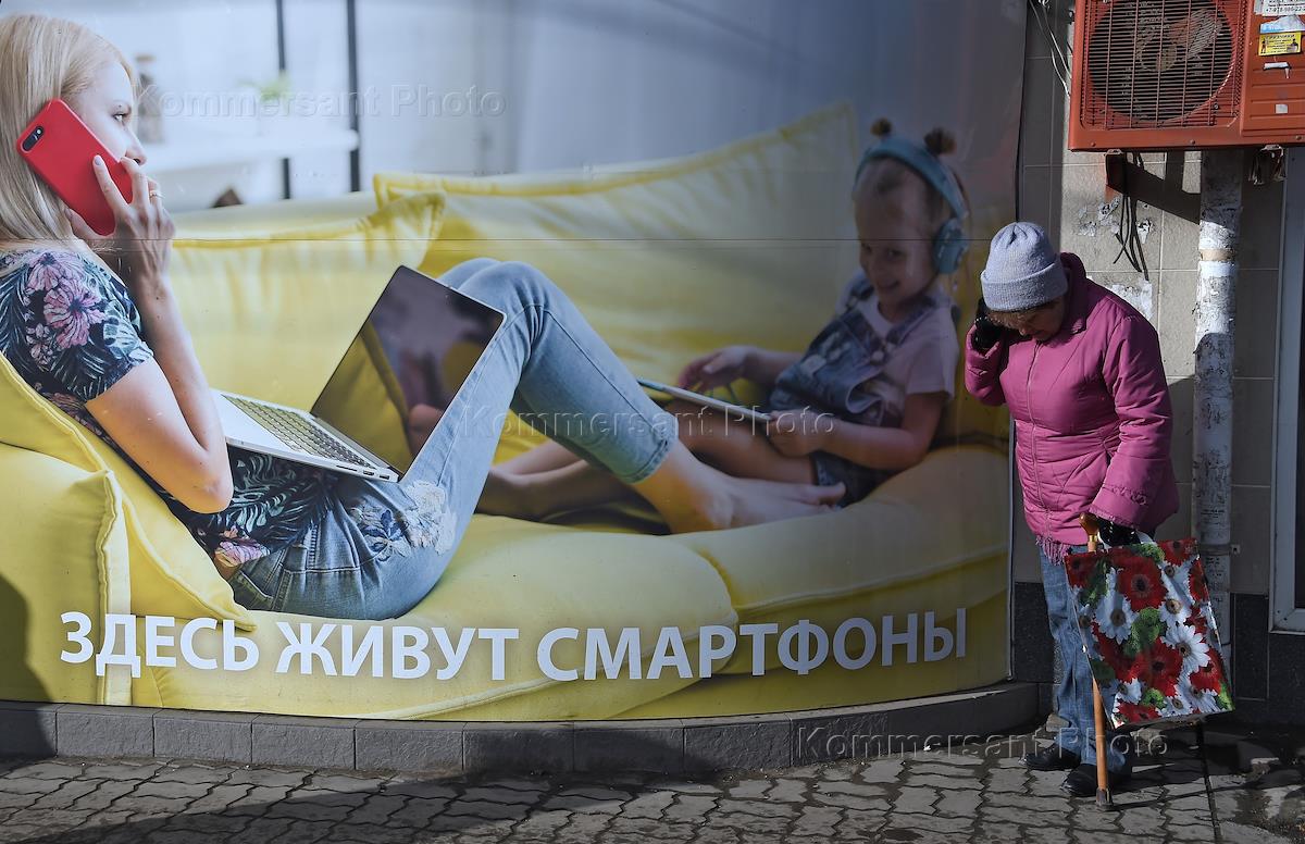 Жанровая фотография. Женщина у рекламного плаката с надписью "Здесь живут смартфоны".