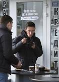 Жанровая фотография. Мужчины едят в уличном кафе фаст-фуд. Надпись "Кредиты".