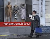 Жанровая фотография. Женщина перед витриной магазина женской одежды с объявлением о полной ликвидации товара.
