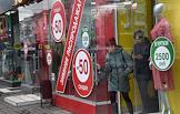 Жанровая фотография. Реклама скидок на витрине магазина верхней одежды.