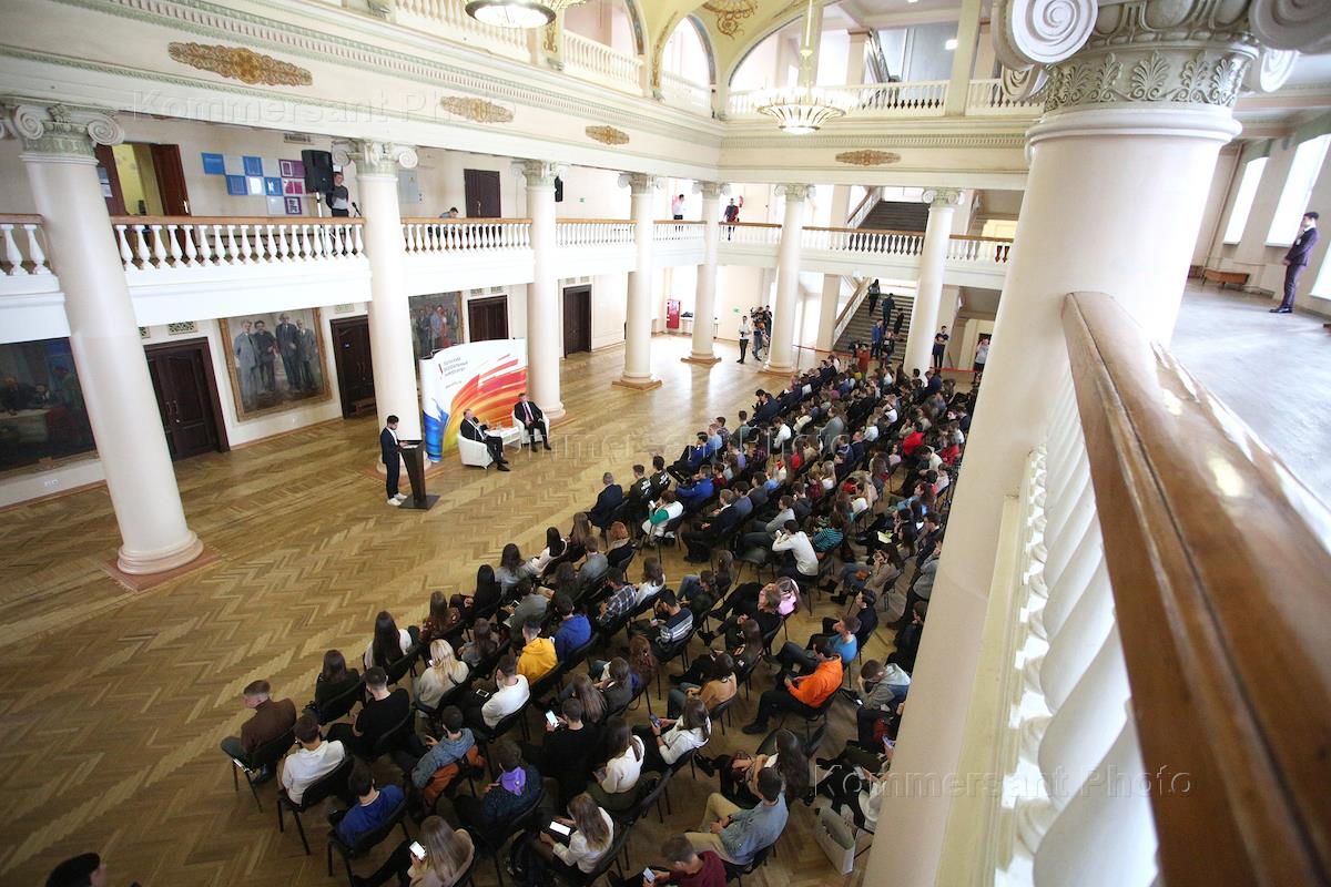Визит полномочного представителя президента России Уральском федеральном округе (УрФО) Николая Цуканова в Уральский федеральный университет (УрФУ). Студенты на встрече.