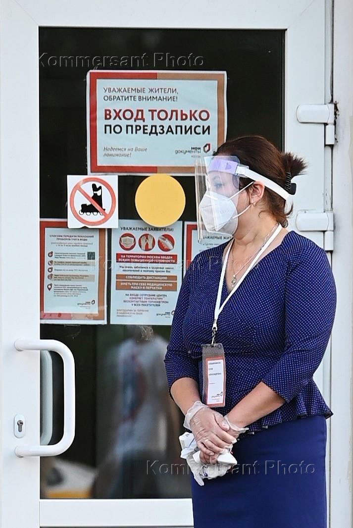 Removal of restrictions after self-isolation regime caused by the danger of the coronavirus COVID-19 spread. Genre photo. Employee of My Documents Multifunctional Center wearing face mask and face shield stands in front of the entrance.