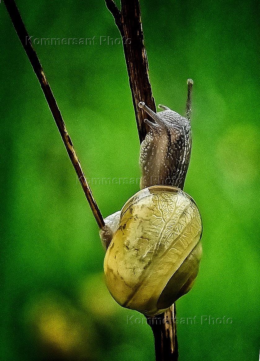 Genre photo. Snail on a dry stalk.