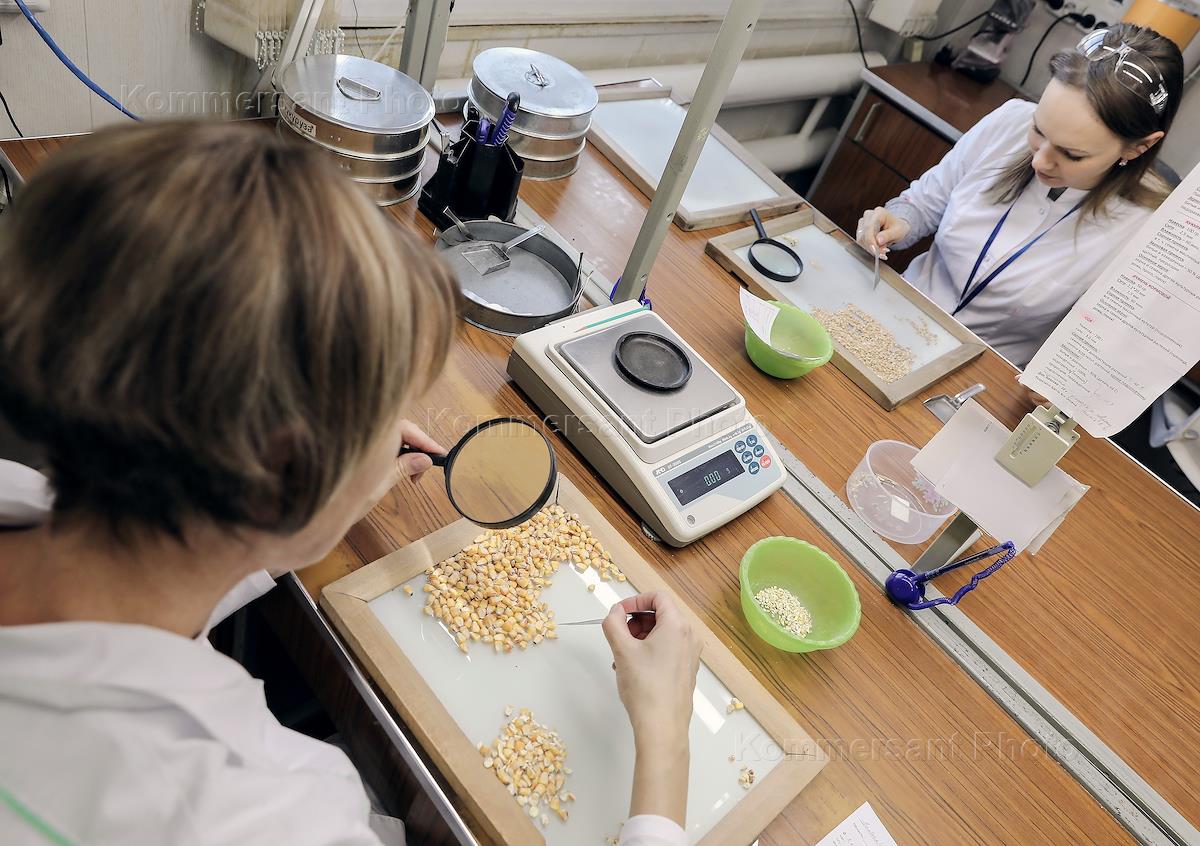 Технический анализ зерна кукурузы и пшеницы. Лаборанты проводят проверку зерен кукурузы и пшеницы на сорную и зерновую примесь, на наличие битых зерен. Лаборатория Волгоградского элеватора.
